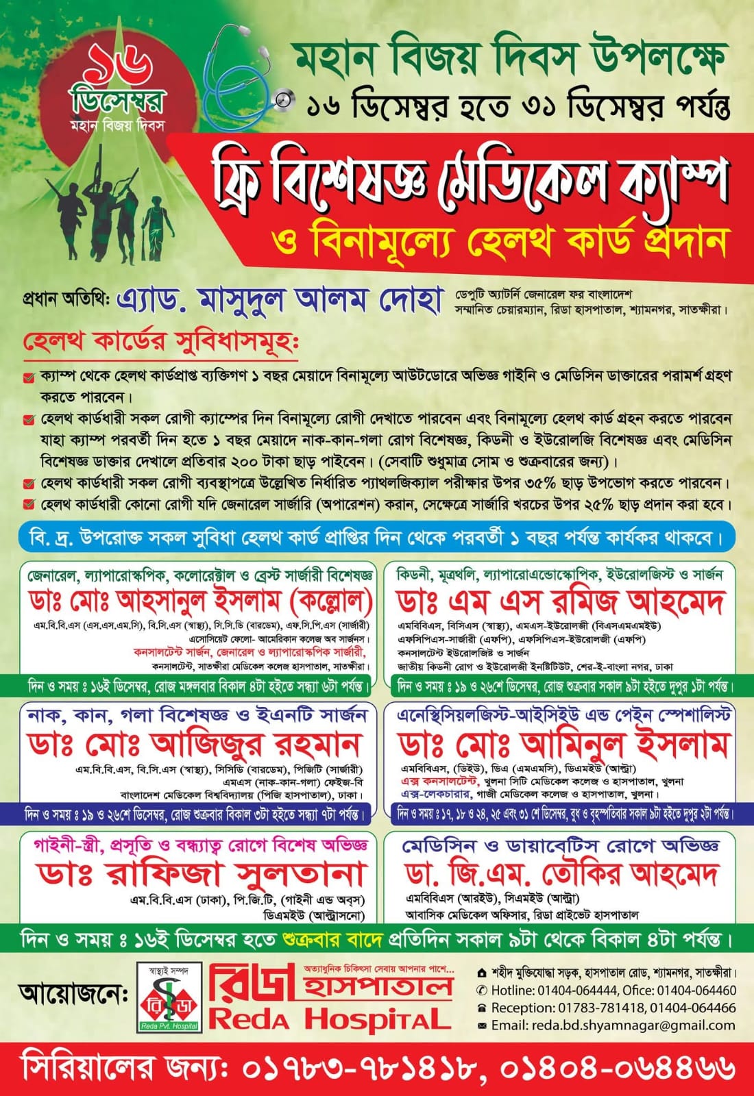 মহান বিজয় দিবস উপলক্ষে রিডা হাসপাতাল, কালীগঞ্জের উদ্যোগে আজ এক বিশেষ ফ্রি বিশেষজ্ঞ মেডিকেল ক্যাম্প ও বিনামূল্যে হেলথ কার্ড বিতরণ কর্মসূচি সফলভাবে অনুষ্ঠিত হয়েছে।