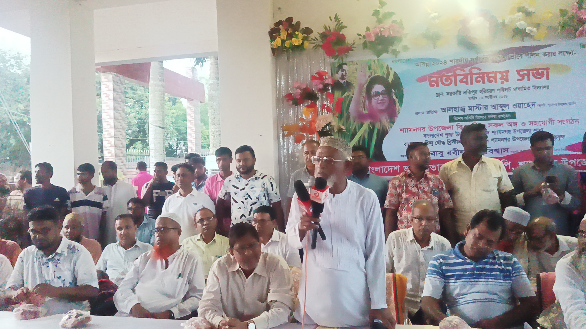শ্যামনগরে আসন্ন শারদীয় দুর্গাপূজা উৎসব সফলভাবে পালনের লক্ষ্যে পূজা উদযাপন কমিটির সাথে উপজেলা বিএনপির মত বিনিময় সভা অনুষ্ঠিত হয়েছে।সোমবার বিকাল তিনটায় শ্যামনগর পাইলট মাধ্যমিক বিদ্যালয় সম্মেলন কক্ষে উপজেলা পূজা উদযাপন কমিটির সভাপতি বাবুর রবীন্দ্রনাথ বিশ্বাস এর সভাপতিত্বে উক্ত মতবিনিময় সভায় প্রধান অতিথি হিসেবে উপস্থিত ছিলেন শ্যামনগর উপজেলা বিএনপির সভাপতি সাবেক ইউপি চেয়ারম্যান, সাবেক প্রধান শিক্ষক আলহাজ্ব মাস্টার আব্দুল ওয়াহেদ।