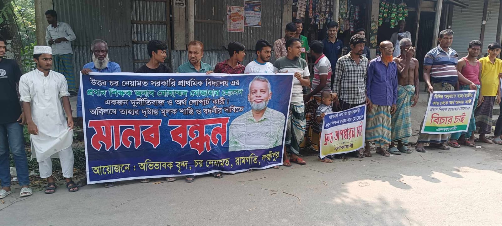 লক্ষ্মীপুর রামগতি উপজেলার ঐতিহ্যবাহী উত্তর চর নেয়ামত সরকারি প্রাথমিক বিদ্যালয়ের সুনাম পুনরুদ্ধারে অনিয়ম ও দুর্নীতির সাথে সম্পৃক্ত প্রধান শিক্ষক মোহাম্মদ মোজাহার হোসেনের অপসারণের দাবিতে বিদ্যালয়ের এলাকার নোয়াখালী টু রামগতি আঞ্চলিক সড়কের পাশে মানববন্ধন করেছে অভিভাবক, যুব সমাজ ও এলাকাবাসী। বুধবার ৩০ অক্টোবর সকাল ১১ টায় মানববন্ধন কর্মসূচি পালিত হয়।
