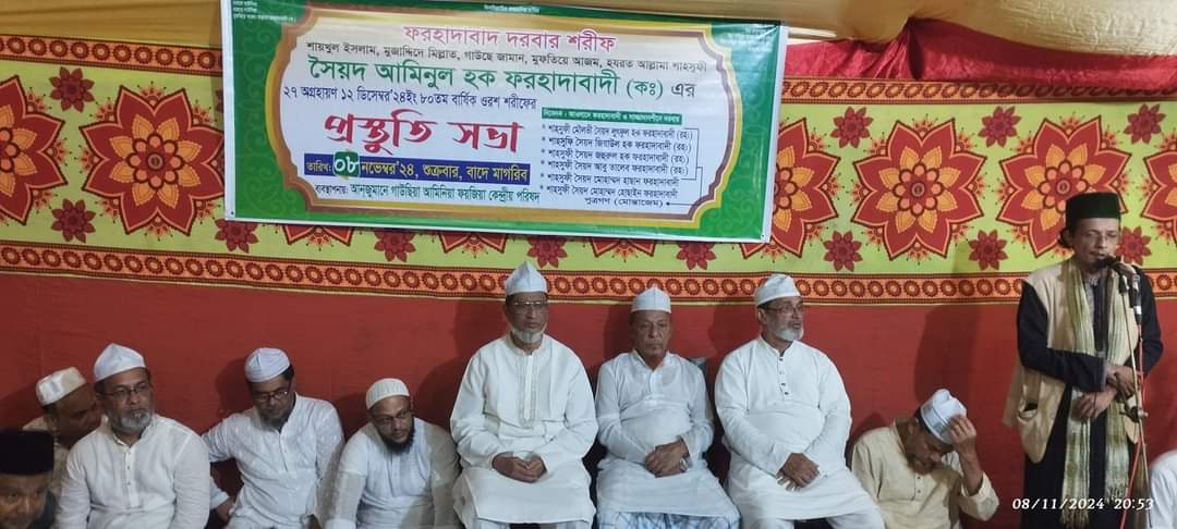 ইমামুল আউলিয়া, হুজুর গাউসুল আজম মাইজভান্ডারী শাহসুফি সৈয়দ আহমদ উল্লাহ (কঃ)'র অন্যতম খলিফা মুফতিয়ে আজম আল্লামা শাহসুফি সৈয়দ আমিনুল হক ফরহাদাবাদী(কঃ)'র আগত ৮০তম বার্ষিক ওরশ শরীফের প্রস্তুুতিসভা গতকাল ৮ নভেম্বর শুক্রবার দরবারের ময়দানে"আনজুমানে গাউসিয়া আমিনিয়া ফয়জিয়া "কেন্দ্রীয় পরিষদের ব্যবস্থাপনায় শাহসুফি সৈয়দ মুহাম্মদ হাসান ফরহাদাবাদীর সভাপতিত্বে অনুষ্ঠিত হয়।উক্ত সভায় প্রধান মেহমান ছিলেন শাহসুফি সৈয়দ মুহাম্মদ হোসাইন ফরহাদাবাদী।আওলাদগনের মধ্যে উপস্থিত ছিলেন শাহজাদা সৈয়দ নুরুল আলম,শাহজাদা সৈয়দ মঈন উদ্দিন,শাহজাদা সৈয়দ জয়নাল আবেদিন,শাহজাদা সৈয়দ জামাল উদ্দিন,শাহজাদা সৈয়দ নাছির উদ্দিন,শাহজাদা সৈয়দ সালাউদ্দিন,শাহজাদা সৈয়দ তকিউদ্দিন।গোলামুর রহমান রাজুর সন্ঞালনায় সভায় আসন্ন ওরশ শরীফের বিভিন্ন দিক নিয়ে আলোচনায় অংশ গ্রহন করেন হারুয়ালছড়ি দরবারের সাজ্জাদানশীন মুফতি আল্লামা কায্বী মুহাম্মদ বোরহান উদ্দিন সফিউল বশর,শাহজাদা সৈয়দ মঈন উদ্দিন,শাহজাদা সৈয়দ জামাল উদ্দিন, মওলানা শেখ আরিফুর রহমান, সাফায়াতুল ইসলাম সাবাল, হুমায়ুন কবির,পারশেদ বিন আনোয়ার,নুরুল ইসলাম, সৈয়দ গোফরান উদ্দিন ফরহাদ প্রমূখ।সমাপনি বক্তব্য প্রদান করেন ওরশ শরীফ পরিচালনা কমিটি ও আল্লামা ফরহাদাবাদী একাডেমির সভাপতি শাহজাদা সৈয়দ নুরুল আলম ফরহাদাবাদী।অন্যান্যদের মধ্যে উপস্থিত ছিলেন সৈয়দ সফিউল আনোয়ার,মওলানা সৈয়দ মোফাক্কেরুল ইসলাম,সালমান সাইফ খান,সৈয়দ মাহবুব আলী সাজু মেম্বার,মাস্টার বদিউল আলম,সৈয়দ করিমুল আবেদিন,মিল্লাত হোসেন মুহুরী,এনামুল হক মুহুরী,নাছির উদ্দিন মন্টু,মাহমুদুল্লাহ মেম্বার,নুর হোসেন কন্ট্র,শেখ মুহাম্মদ হাসান উদ্দিন,আবুল বশর,সৈয়দ মহরম আলী,সৈয়দ মঈনুদ্দিন,জহুর সওদাগর, মুহাম্মদ হোসেন,নুরুল ইসলাম বাশি, ইকবাল তালুকদার, মুহাম্মদ নাজু, হাফেজ জাহেদ, হাফেজ শাফায়েত,হাফেজ মিনহাজ, হাফেজ লোকমান,মওলানা এনাম মুহুরী,হাফেজ আবদুর রহমান, আবুল মনসুর, নাফিজ, ইকরাম হোসেন, মুহাম্মদ বাবু, মোহাম্মদ কদর, করিম সওদাগর, আহমদ উল্লাহ ফারুক, মনি সওদাগর, কলিম সওদাগর, আবুল সওদাগর, হাজী দেলোয়ার হোসেন মানিক, রোকন উদ্দিন,তৌহিদ ড্রাইভার, মুহাম্মদ শাহাদাত, মুহাম্মদ তাইফু, মুহাম্মদ সজিব, মুহাম্মদ জোহা, মোহাম্মদ আলম, নাহিম উদ্দিন রিকু, মহসিন পিয়াস মুহুরী, আলাউদ্দিন মুন্নাসহ বিশিষ্ট ব্যক্তিবর্গ।মিলাদ কিয়াম পরিচালনা করেন সাহেবজাদা সৈয়দ সামিউল হক ফরহাদাবাদী। মুনাজাত করেন আল্লামা কায্বী মুহাম্মদ বোরহান উদ্দিন সফিউল বশর।সর্বশেষ সকলের মাঝে তবারুক পরিবেশন করা হয়।