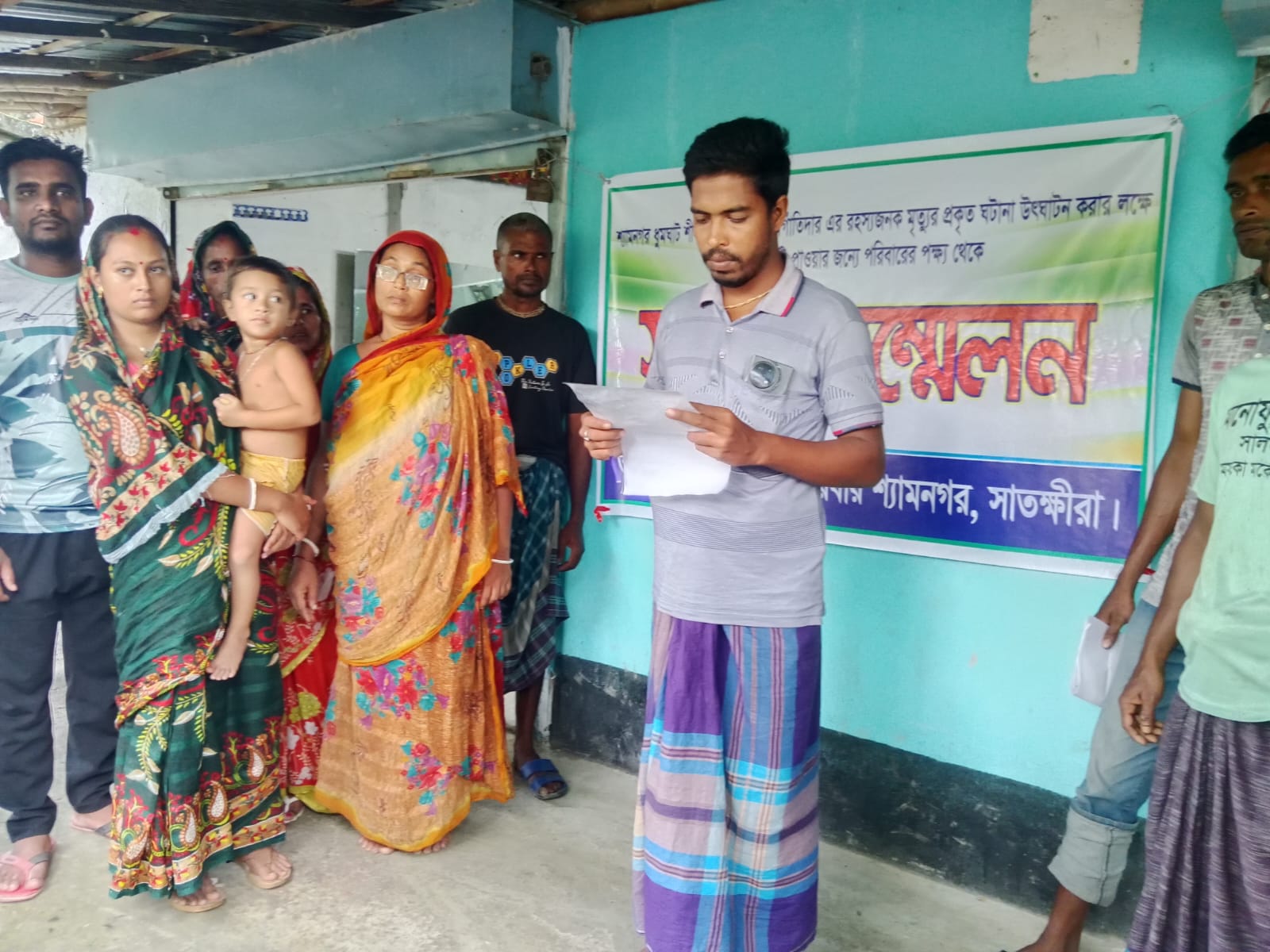 শ্যামনগর উপজেলার ধুমঘাট নাসির আলী ব্রীজ সংলগ্ন শীলতলা এলাকায় স্কুল পড়ুয়া সুদেবী গাতিদারের গলায় রশি দিয়ে রহস্য জনক মৃত্যু নিয়ে রোববার বিকালে পরিবারের সদস্যরা সংবাদ সম্মেলনের মাধ্যমে প্রসাশনের হস্তক্ষেপ কামনা করেছেন। প্রায় ১৪ দিন আগে ধুমঘাট আদর্শ মাধ্যমিক বিদ্যালয়ের শিক্ষার্থী সুদেবী গাতিদার গলায় ওড়না বেচিয়ে আত্মহত্যা করে,পরে ময়না তদন্তের জন্য প্রসাশন মর্গে পাঠায়,এ বিষয়ে থানায় একটি লিখিত অভিযোগ করা হয়, সেখানে মৃত্যু টা কে রহস্য জনক এবং একই এলাকার ধুমঘাট শীলতলা এলাকার হাফিজুর হালদার এর ছেলে শাহিন হালদার প্রায় স্কুল যাওয়ার পথে সুদেবীকে উৎত্যাক্ত করতো, আমরা মনে করছি, শাহিনের নেতৃত্বে তার সঙ পাঙ্গুরা আমাদের সুদেবীকে হত্যা করে বাড়ীতে কেউ না থাকার সুবাদে তাকে ঘরের আড়ায় ঝুলিয়ে দিয়ে আত্মহত্যা বলে চালিয়ে দিচ্ছে তারা -- এতক্ষণ সংবাদ সম্মেলনে লিখিত বক্তব্যে সুদেবীর পরিবারে পক্ষ থেকে মিঠুন বৈদ্য জানাচ্ছিল। তিনি এ সময় আরো বলেন,ইতিপূর্বে উক্ত শাহিন কে আমরা অনেকবার নিষেধ করেছি সুদেবী কে উৎত্যাক্ত না করার জন্য কিন্ত আমাদের কথা না শুনে সুদেবী কে একের পর এক উৎত্যাক্ত করার পাশাপাশি তাকে হত্যা করেছে,তাকে হত্যা করে আড়ায় ঝুলিয়ে রেখে বাহিরে থেকে ঘরে তালা মেরে তারা পালিয়ে যায়।সুদেবীর পিতা প্রভাষ গাতিদার বলেন,আমার মেয়ে স্কুলে যাওয়ার সময় ও মোবাইল ফোনে প্রায় উৎত্যাক্ত করতো শাহিন, বিষয়টি নিয়ে আমার এলাকার লোকজন নিয়ে ওর বাবা কে বলেছি, এ ঘটনায় তার পর থেকে শাহিন আরো ক্ষিপ্ত হয়ে আমার মেয়ে কে তার কব্জায় না আনতে পেরে সে পরিকল্পিত ভাবে হত্যা করেছে।সুদেবী পরিবারের লোকজনের নিরাপত্তার পাশাপাশি তারা স্কুল পড়ুয়া সুদেবী গাতিদারের রহস্য জনক মৃত্যুর প্রকৃত ঘটনা উৎঘাটনের জন্য প্রসাশনের হস্তক্ষেপ কামনা করা হয়েছে।