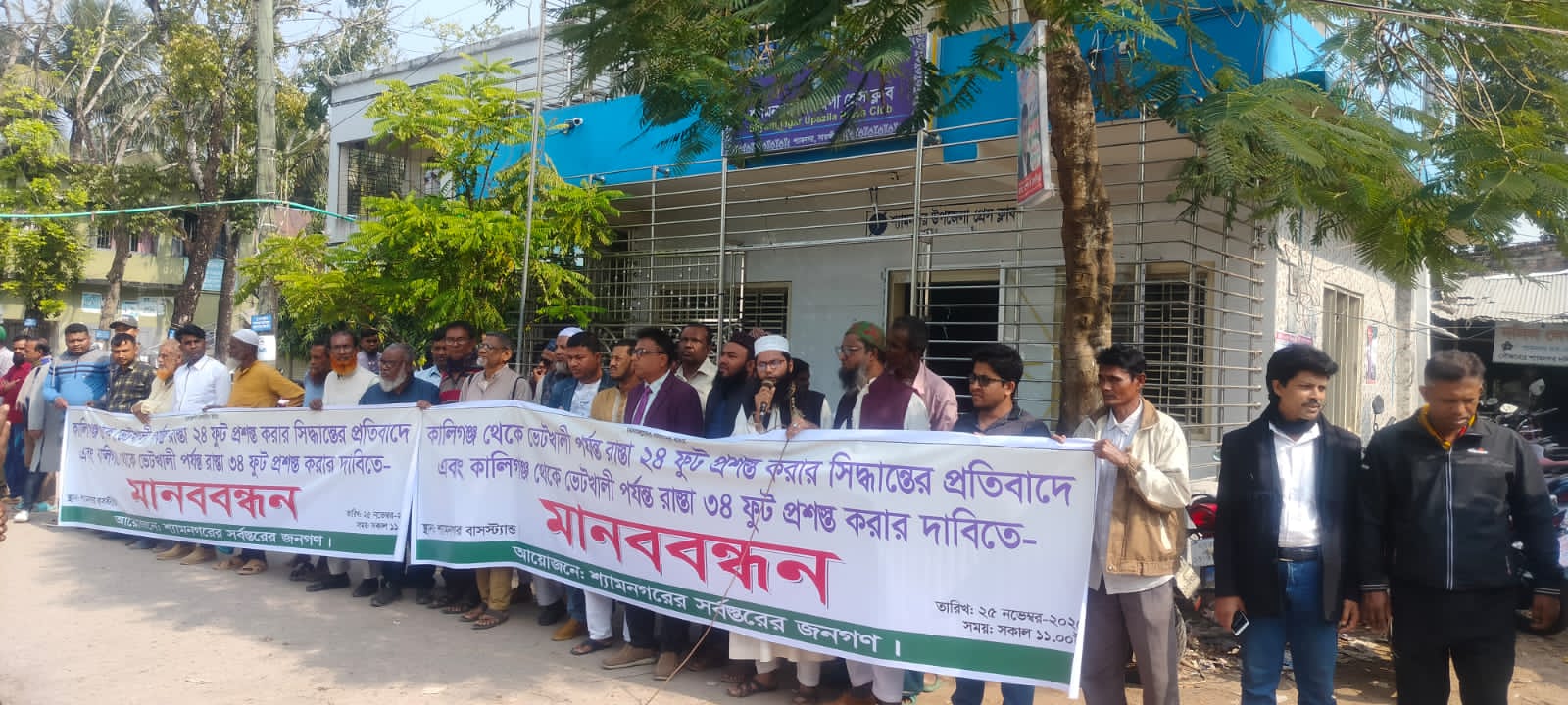 সাতক্ষীরার কালিগন্জ শ্যামনগর হয়ে ভেটখালী পর্যন্ত মহাসড়ক ৩৪ ফিট প্রশস্ত করার দাবিতে এক মানববন্ধন অনুষ্ঠিত হয়েছে। মঙ্গলবার (২৫নভেম্বর) সকাল ১১টায় শ্যামনগর প্রেসক্লাবের সামনে শ্যামনগরের বিভিন্ন ইউনিয়ন হতে আগত সকল শ্রেণি পেশা মানুষ উপস্থিতিতে এ মানববন্ধন অনুষ্ঠিত হয়। অনুষ্ঠানে বক্তারা বলেন, শ্যামনগর মানুষ ইতিমধ্যে জানতে পেরেছে সাতক্ষীরা হইতে কালিগঞ্জ কাঁক শিয়ালী নদী ব্রিজ পর্যন্ত ৩৪ ফুট প্রশস্ত হবে। তারপর থেকে কালিগঞ্জ হতে ভেটখালী পর্যন্ত ২৪ ফুট প্রশস্ত হবে। এতে করে শ্যামনগর মানুষের প্রতি বৈষম্য করা হচ্ছে দাবি করে প্রতিবাদে, শ্যামনগরের সর্বস্তরের পেশাজীবী মানুষরা আজকের এই মানববন্ধনে দাড়িয়ে প্রতিবাদ জানান। তারা বলেন, শ্যামনগর হইতে বাংলাদেশের বিভিন্ন প্রান্তে এই মহাসড়ক দিয়ে বিভিন্ন ধরনের যানবাহন প্রতিনিয়ত চলাচল করে। শুধু তাই নয় সুন্দরবন পর্যটন কেন্দ্র ভ্রমনের জন্য বাংলাদেশের বিভিন্ন জায়গা হতে প্রতিদিন প্রায় হাজার হাজার ভ্রমনকারী পরিবহন, বাস, মিনিবাস, মাইক্রো সহ বিভিন্ন ধরনের শত শত যানবহনে যাতায়াত করে থাকে। মহাসড়কটির প্রশস্ত ৩৪ ফিটের স্থলে ২৪ ফিট হওয়ায় অত্যাধিক যানজট সৃষ্টি হবে। বক্তাদের বক্তব্য উঠে আসে শ্যামনগরের বুকে অবস্থিত শ্যামনগর সরকারি মহসিন কলেজ, শ্যামনগর আতরজান কলেজ, শ্যামনগর সরকারি পাইলট হাই স্কুল, ম্যানেগ্রোভ সুন্দরবন ও ভৌগলিক দিক দিয়ে বাংলাদেশের সর্ববৃহৎ উপজেলা শ্যামনগর। শ্যামনগরের সাদা সোনা, বাগদা চিংড়ী সহ হরেক রকমের মৎস্য ও কাঁকড়া এই সড়ক দিয়ে দেশের বিভিন্ন স্থানে রফতানি ও বিভিন্ন দেশে রফতানি হয়ে থাকে। শ্যামনগরের সর্বস্তরের মানুষের প্রাণের দাবি এই মহাসড়কটি ৩৪ ফিট প্রশস্ত করতে হবে। তা না হলে আমাদের আন্দোলন চলমান থাকবে।