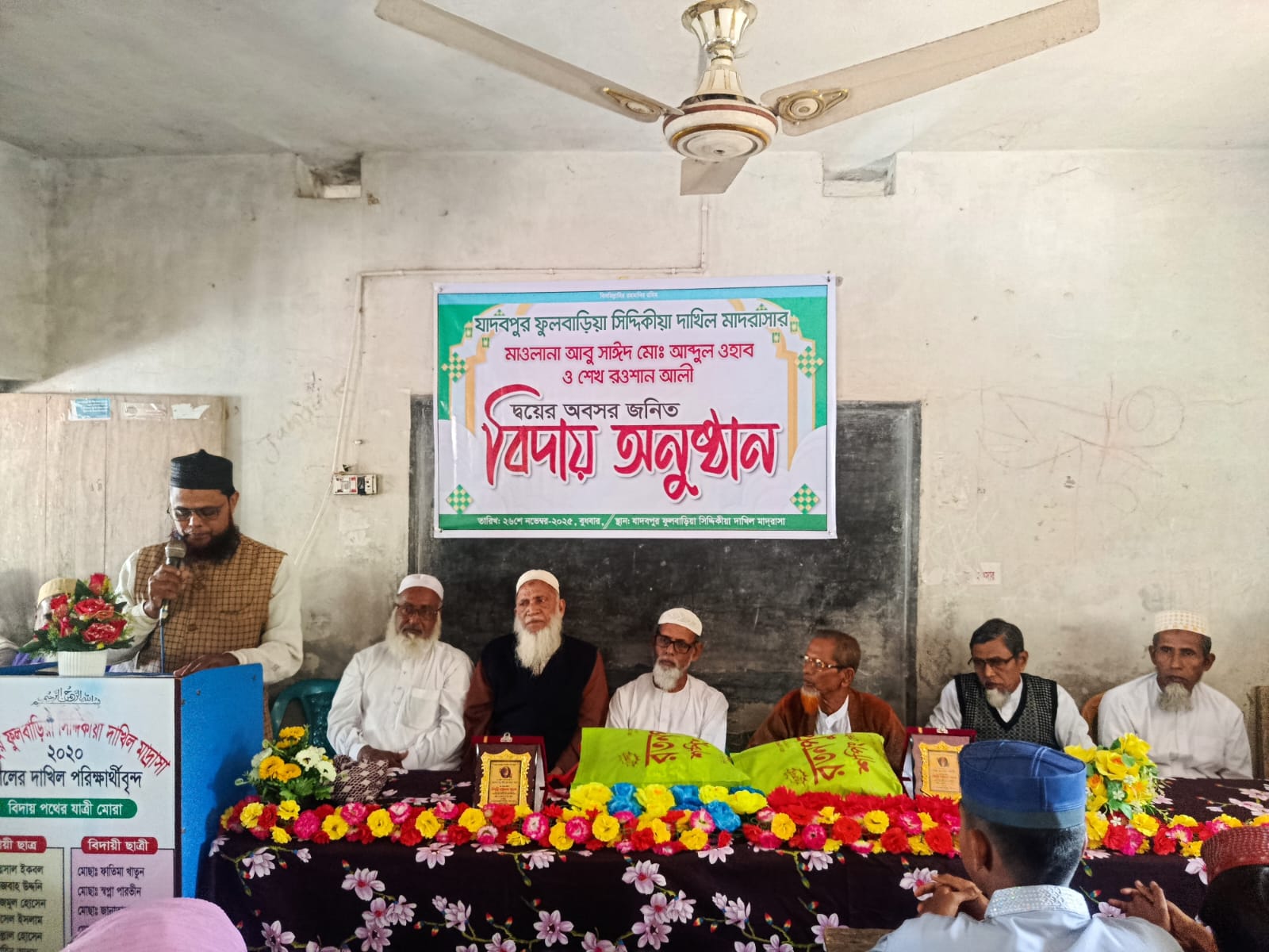 যাদবপুর উত্তর ফুলবাড়িয়া সিদ্দিকিয়া দাখিল মাদ্রাসায় এক আবেগঘন বিদায় সংবর্ধনা অনুষ্ঠিত হয়েছে। দীর্ঘ কর্মময় জীবন শেষে অবসর গ্রহণ করায় সম্মানিত শিক্ষক মাওলানা আব্দুল্লাহ আবু সাঈদ মোহাম্মদ আব্দুল ওয়াহাব এবং অফিস সহকারী শেখ রওশন আলীকে আন্তরিক ভালোবাসা ও সম্মানের সঙ্গে বিদায় জানানো হয়।