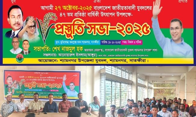 মোঃ রায়হান হোসেন সাতক্ষীরার শ্যামনগর উপজেলায় যুবদলের ৪৭ তম প্রতিষ্ঠাবার্ষিকী উপলক্ষে শ্যামনগর উপজেলা যুবদলের প্রস্তুতি সভ-২০২৫ অনুষ্ঠিত হয়েছে। ১৮ অক্টোবর (শনিবার) উপজেলা যুবদলের ভারপ্রাপ্ত আহবায়ক জনাব