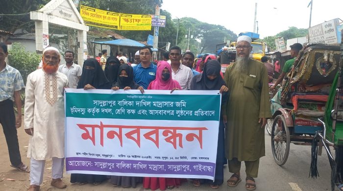 ফয়সাল রহমান জনি গাইবান্ধা জেলা প্রতিনিধি। গাইবান্ধার সাদুল্লাপুর ভূমি উপজেলা অফিস সংলগ্ন সাদুল্লাপুর বালিকা দাখিল মাদ্রাসার জমি ভূমিদস্যু কর্তৃক দখল,শ্রেণী কক্ষ এবং আসবাবপত্র লুন্ঠনের প্রতিবাদে মানববন্ধন অনুষ্ঠিত