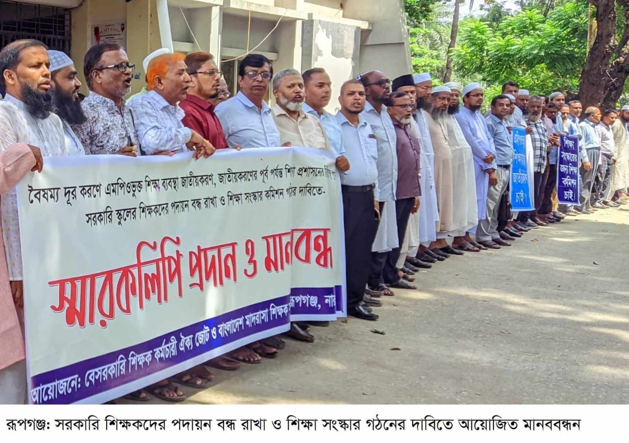 রূপগঞ্জে সরকারি শিক্ষকদের পদায়ন বন্ধ রাখা ও শিক্ষা সংস্কার কমিশন গঠনের দাবিতে মানববন্ধন