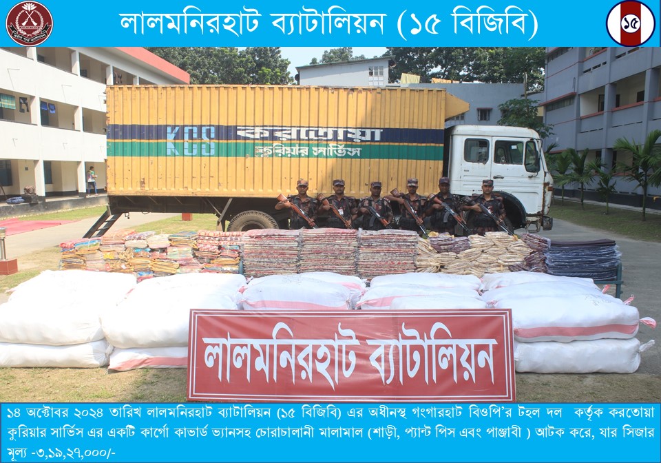(১৫ বিজিবি) কর্তৃক করতোয়া কুরিয়ার সার্ভিস এর কার্গো কাভার্ড ভ্যান সহ ৩ কোটি উনিশ লাখ টাকার অবৈধ মালা মাল আটক।