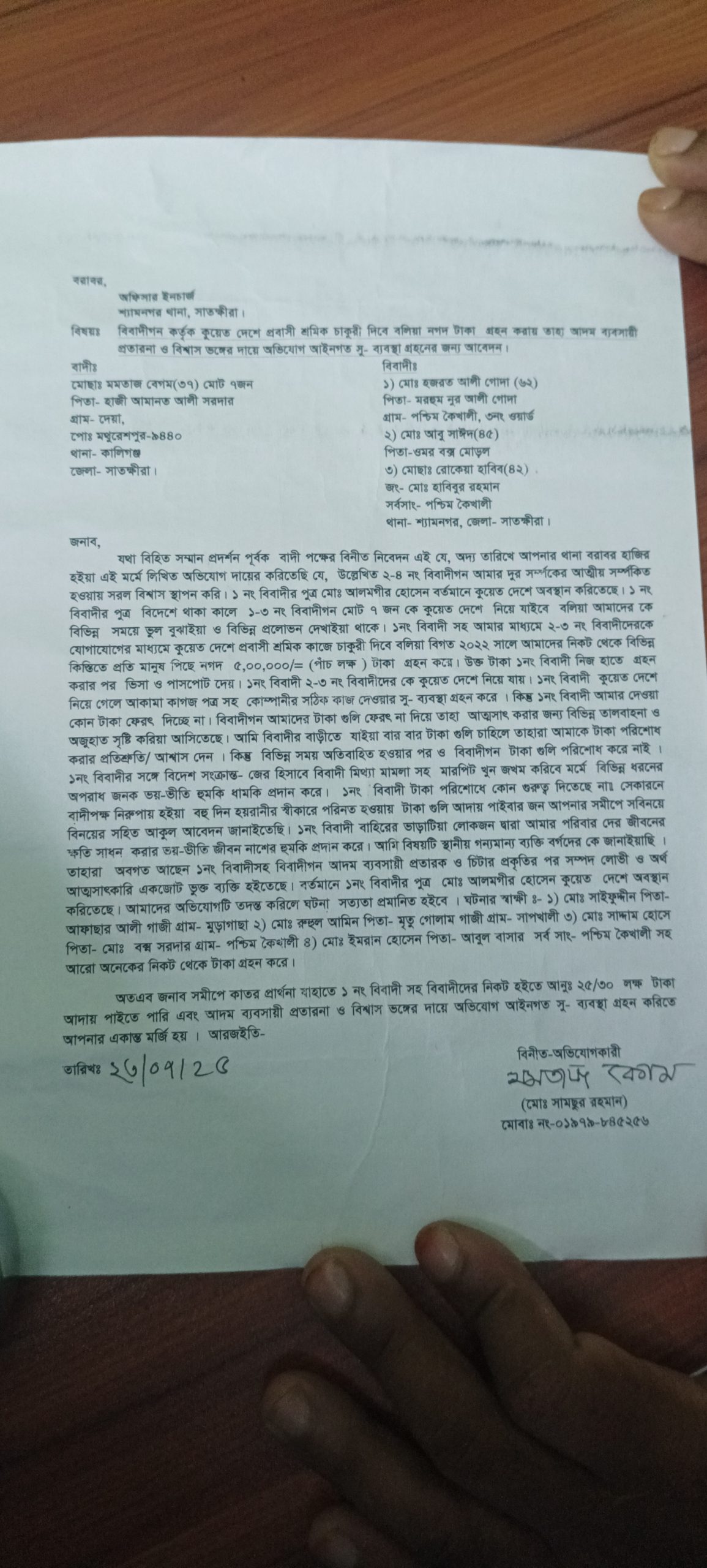 শ্যামনগরে কুয়েত প্রবাসী আদম ব্যবসায়ী প্রতারনা করাই থানায় অভিযোগ দায়ের করেন।