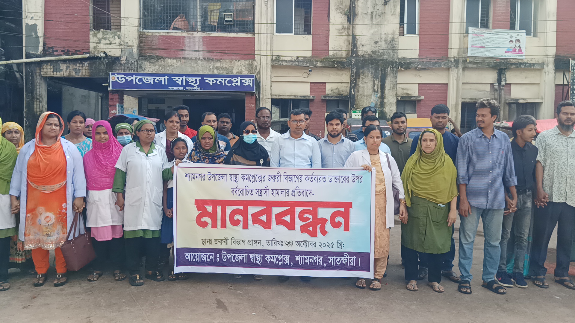 শ্যামনগর হাসপাতালে হামলার ঘটনায় আসামীদের আটক ও নিরাপত্ত্বার দাবিতে ডাক্তার, নার্স, কর্মচারীদের মানববন্ধন অনুষ্ঠিত